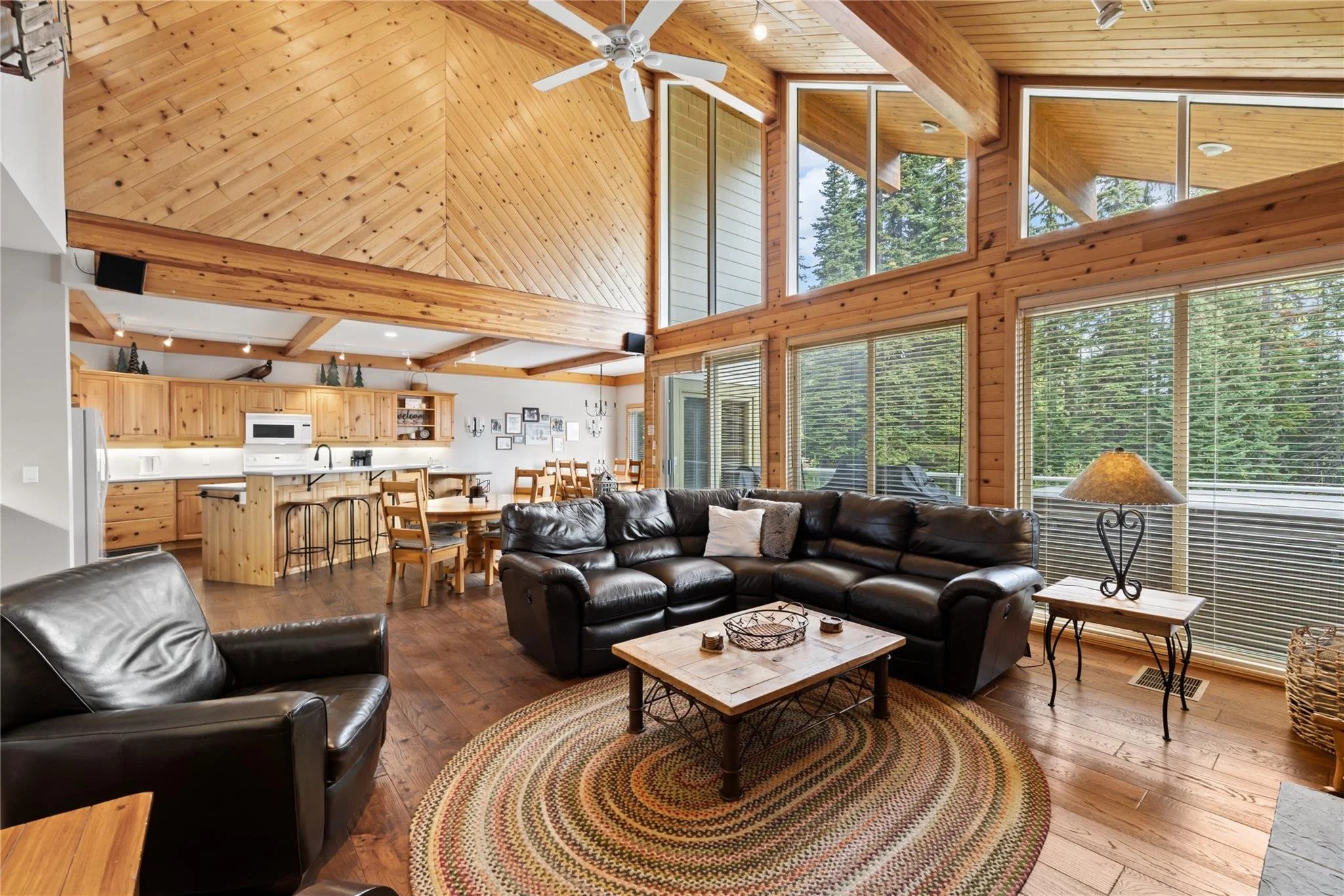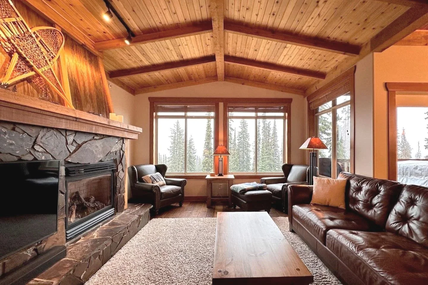 5946 Snow Pines Crescent - an exceptional 4-bedroom, 4.5-bath half duplex home backing on to the Snow Pine Estates access trail offers more than 3,300 square feet of living space across three levels. Rich wood finishes throughout, soaring vaulted wood ceilings, large wood beams, and and two inviting fireplaces create a warm alpine atmosphere. The main level features a bright, open-concept living space that extends onto a generous covered deck with private hot tub—ideal for unwinding after a day on the slopes. Enjoy true ski-in/ski-out access and outstanding entertaining spaces, including a spacious lower-level rec room with bar area, full-size fridge, dishwasher, and walk-out covered patio. Two additional bedrooms and bathrooms on the lower level comfortably accommodate guests, while a private sauna completes the ultimate apres-ski retreat. Perfect as a family mountain escape or a high-performing investment, this home offers the quintessential Big White lifestyle.