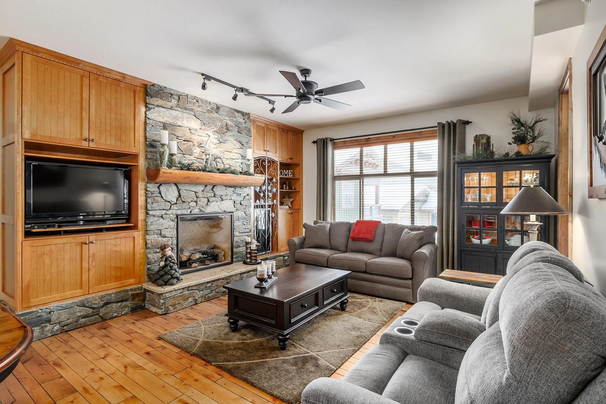 50A Forest Lane - a spacious 3-bedroom, 3-bathroom duplex style ski home in the quiet community of The Forest. This ski home offered a total of 1,774 square feet across three levels of living space plus a loft overlooking the main living area below. The living room’s vaulted ceilings, stone fireplace, wet bar, and access to the private hot tub is the perfect gathering place for après ski. The lower level entry has plenty of storage for all your gear. Ski-in directly to your door from Serwa's ski run.