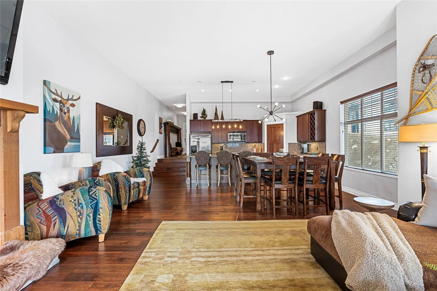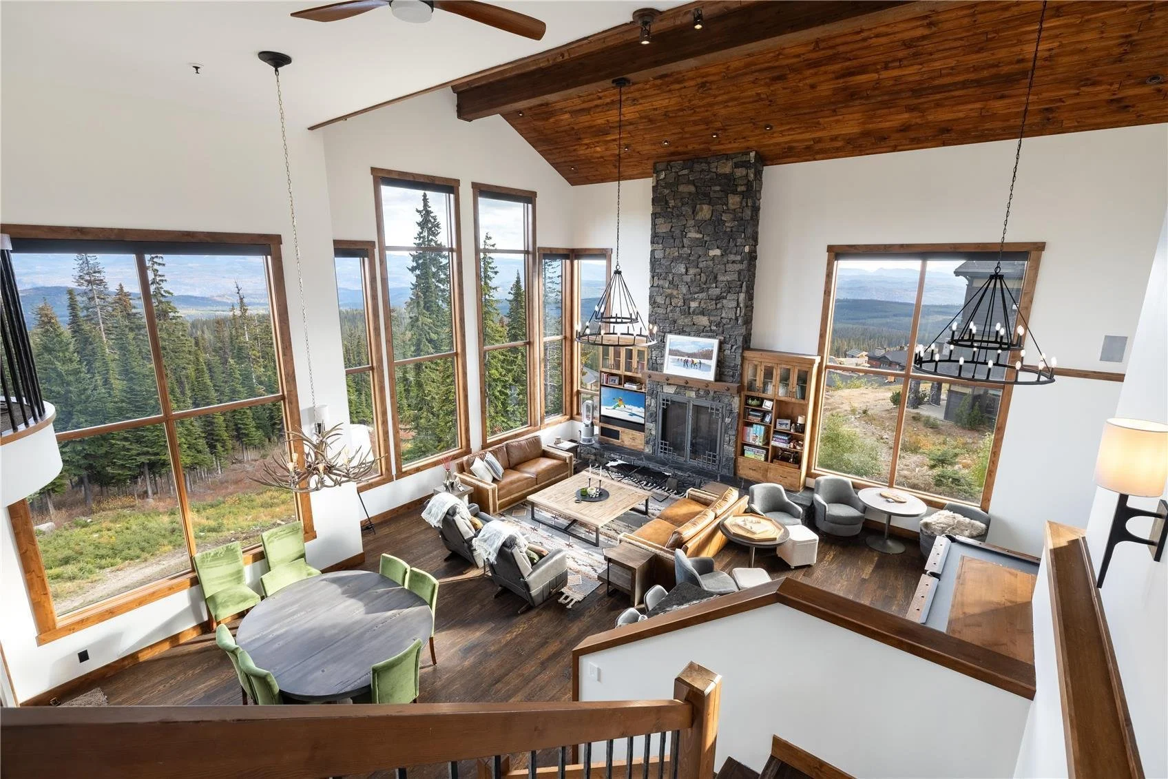 620 Feathertop Way - a true legacy property, Inukshuk Lodge, is a custom ski home built into the mountain side at the edge of the Millie’s Mile ski run. This 4-bedroom and 5-bathroom masterpiece includes a bunk room with handcrafted millwork and altogether the home can comfortably sleep 14 people. Additionally there is plenty of space for the entire family with an office space, theatre room, spacious games room, home gym, sitting room, flex-room, and as perfectly adverised: “a Great Room impresses with soaring 30' ceilings, a well-appointed bar, and a billiards table for entertaining.” The space is amazing and the views are magical. This home was well equipped with a sauna, hot tub, and also included a triple car garage.